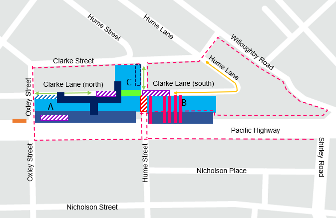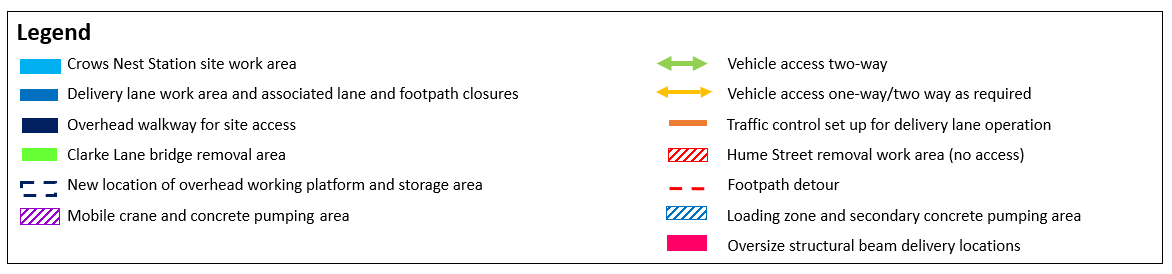 • Set up of a mobile crane and concrete pours will continue on Clarke Lane (south) from Monday 18 July to Thursday 21 July (weather permitting). Access to Hume Street will be restricted during this time and Clarke Lane will be converted into two-way access via Clarke Street at Hume Lane until further notice. In the event of wet weather, activities will occur on the next dry weather day.