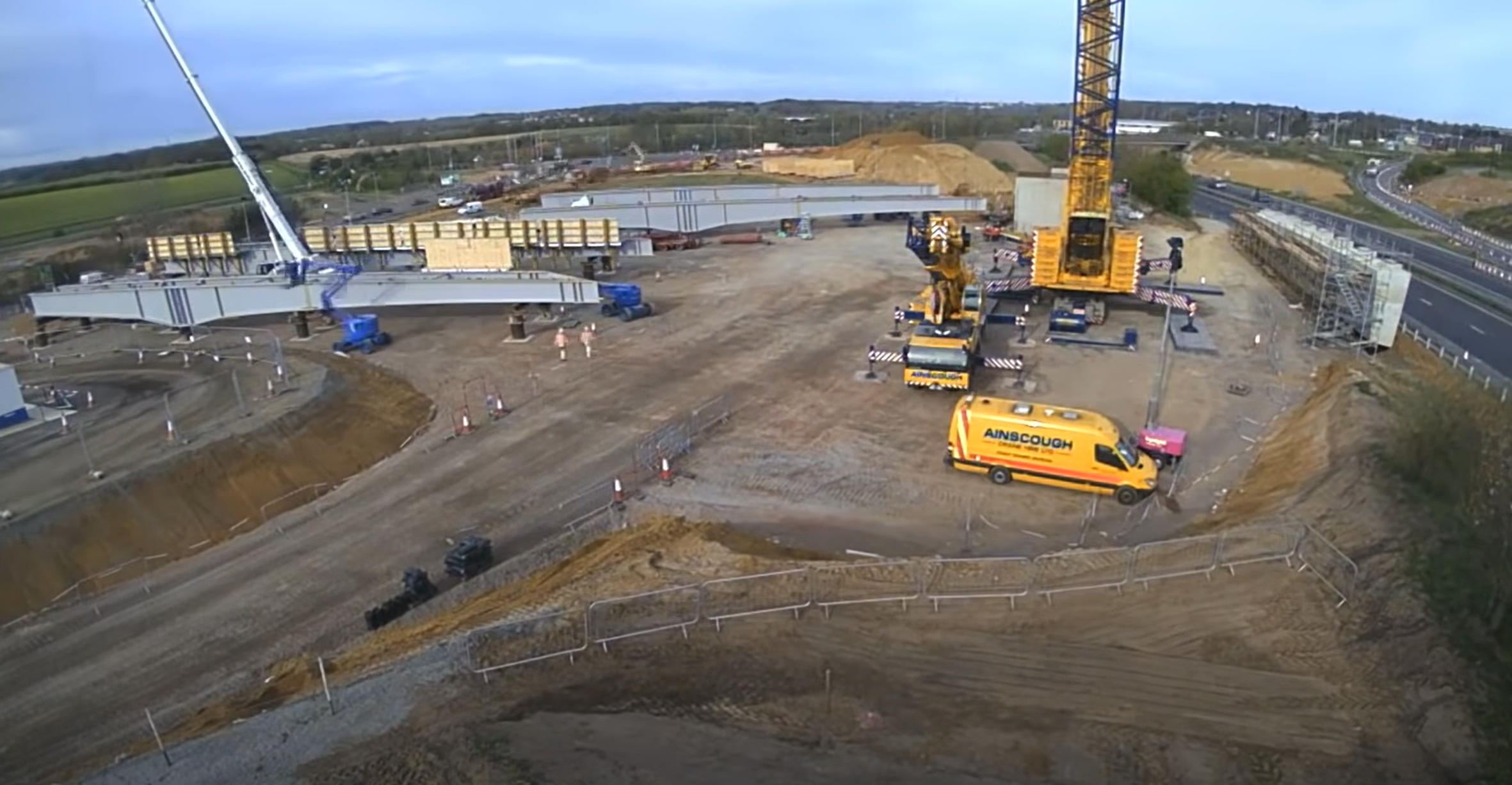 • Sequence Two – 24 and 25 April (go to 18 mins, 11 mins duration). The view shows the A47 closed to traffic, with the arrival and rigging of the main crane (go to 19 mins), arrival of the first beams (go to 23 mins) followed by lifting on to the western piers.