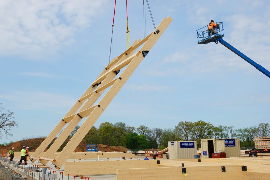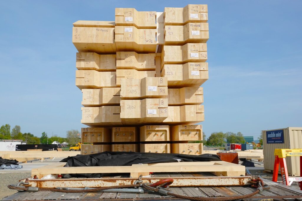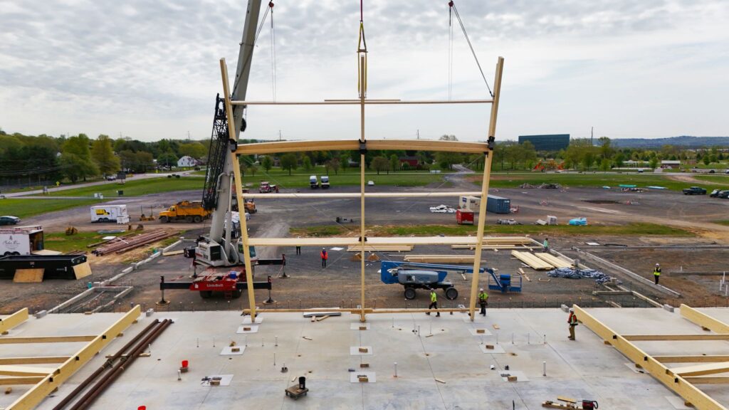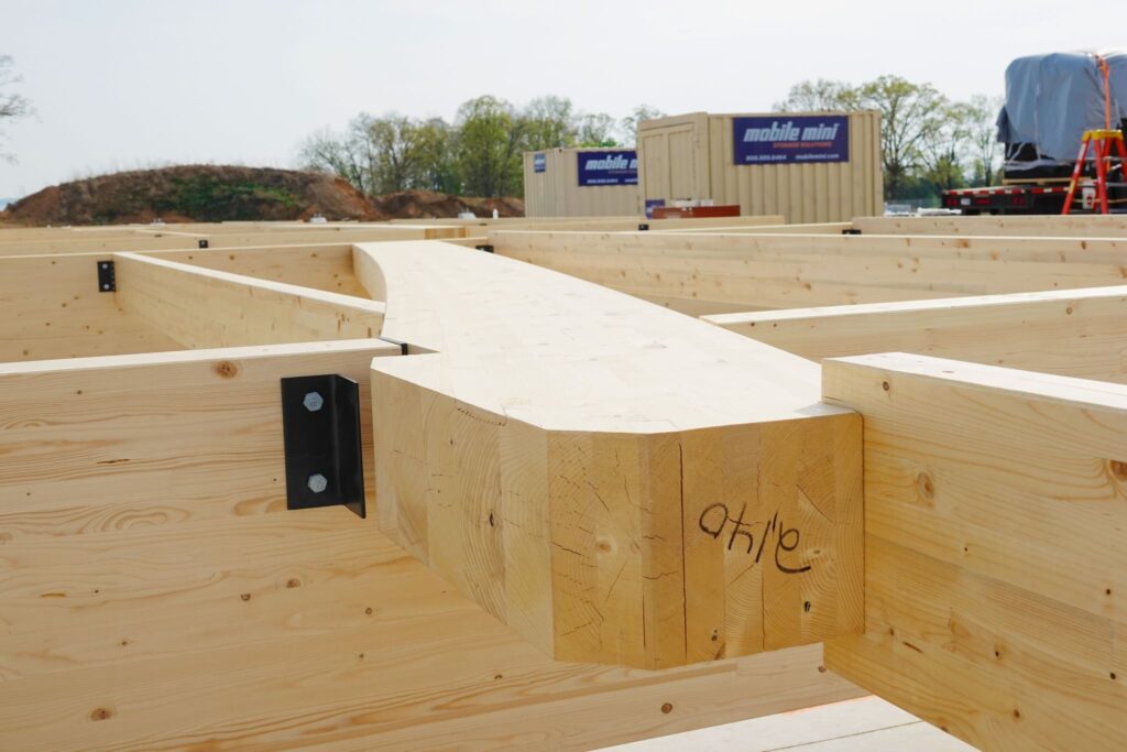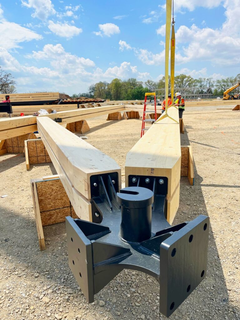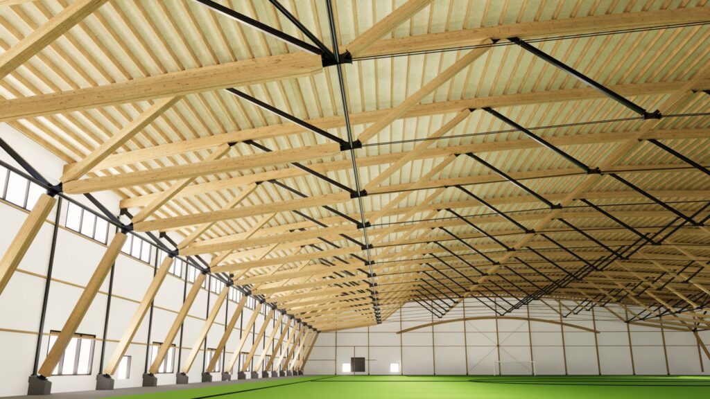 A significant architectural achievement combining timber and steel in portal frame construction spans 280ft (85m) over a soccer court at the Community Lifestyle Center, demonstrating innovative hybrid structural engineering.